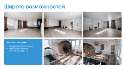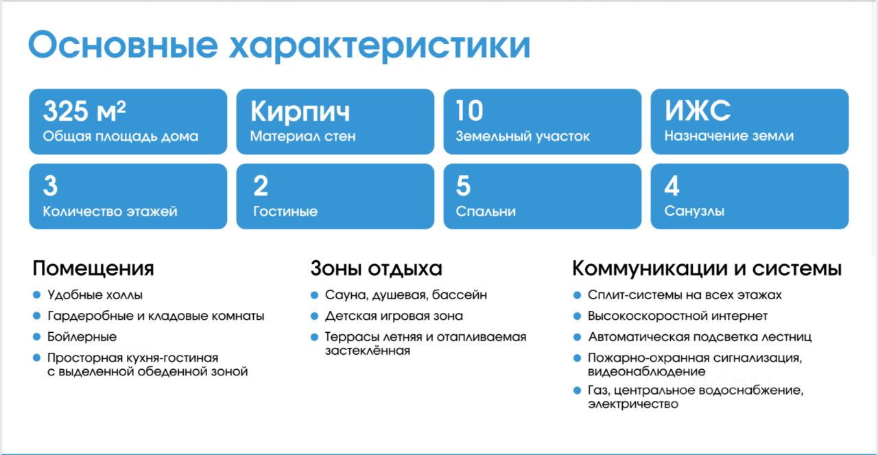 В доме предусмотрены две просторные гостиные, одна из которых с действующим камином, пять спален, большая кухня, разделённая на зону приготовления и зону приёма пищи, кабинет, три санузла, летняя и отапливаемая застеклённая терраса, детская игровая зона, удобные холлы, гардеробные и кладовые комнаты, бойлерные.