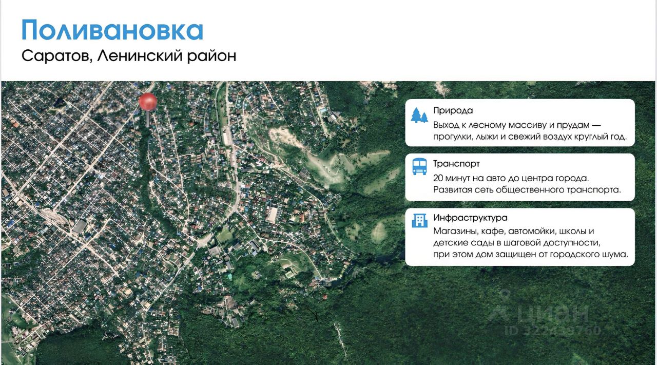 Находится в черте города, в одной из самой экологически чистой локации Саратова.
