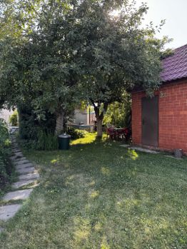 На участке растут 2 яблони, абрикос, груша, вишня, малина, виноград, цветы. В огороде автоматический капельный полив.