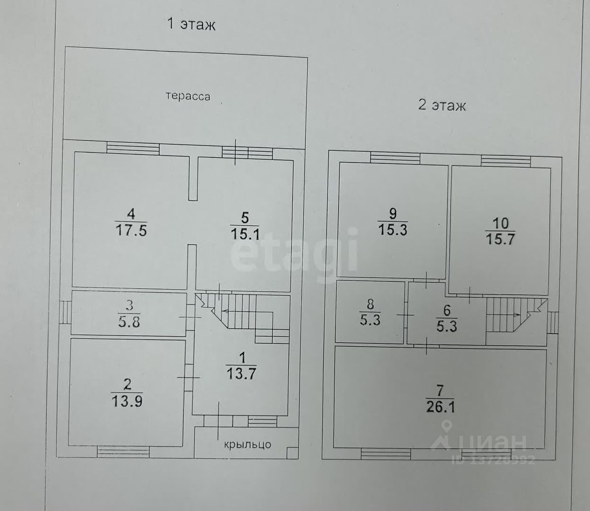 1 этаж включает : 2 комнаты-15,1м2, 13,9 м2, кухня-17,5 м2,сан.узел-5,8 м2,коридор-13,7 м2.