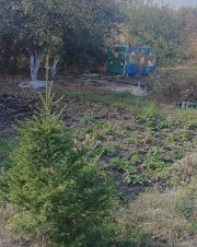 На участке много ёлок, плодоносящий сад: яблони, груши. Ягода: клубника, малина.