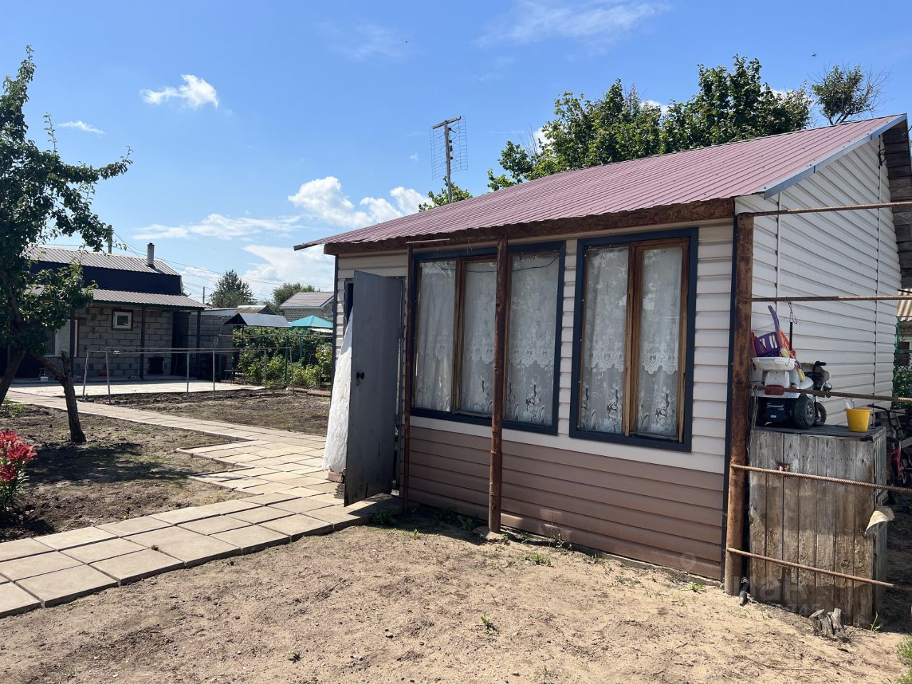 Достаточно много свободного места под грядки или бассейн , между постройками бетонные дорожки.