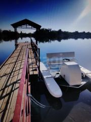 Участок полностью благоустроен: продуманный ландшафтный дизайн включает газон, плодовые деревья, кустарники и хвойные насаждения. Ключевая особенность — прямая выход к воде с собственной прибрежной зоной, где обустроены два пирса, один из которых с беседкой, а также площадка для мангала и лодочная стоянка.