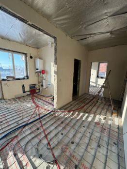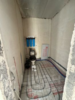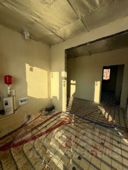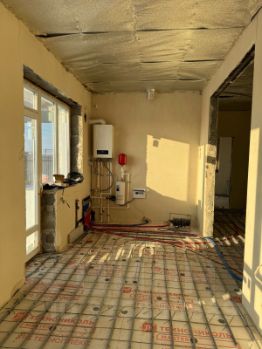 Выполнены работы по черновой отделке - механизированная штукатурка стен, разводка теплого пола по всей площади дома, установка инженерных коммуникаций.
