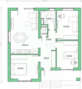 Дом 75 м2, 3 комнаты, кухня-гостиная, холл, прихожая, санузел.