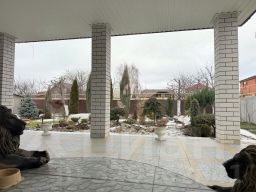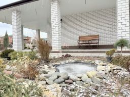 На участке 10 соток размещаются также отдельно стоящая баня, гараж с автоматическими воротами, 2-уровневый погреб, теплица, площадка для бассейна вымощена плиткой.