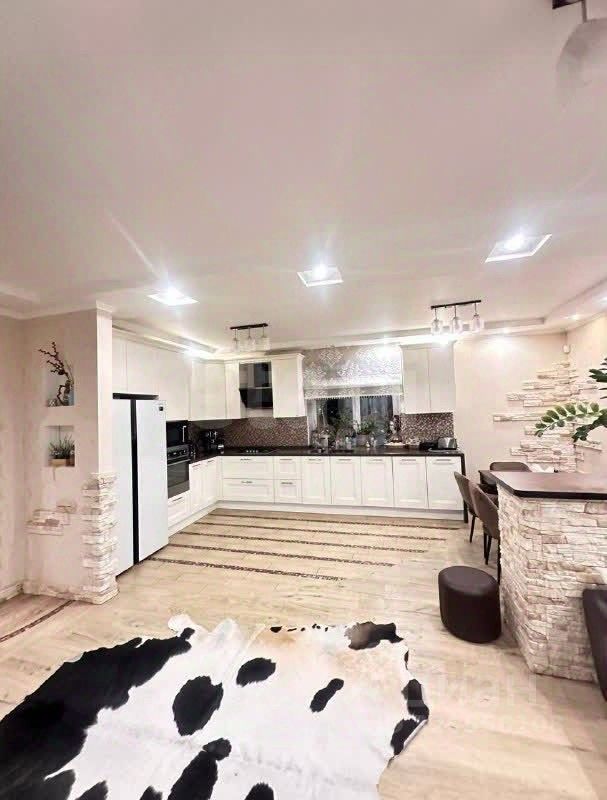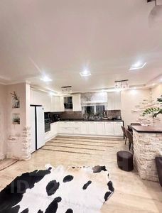 Просторная кухня-гостиная (35 кв.м.) с барной стойкой, каминной зоной.