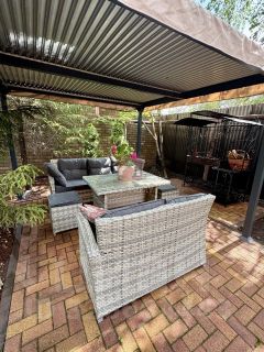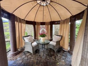 Благоустроенная территория участка: растут хвойные деревья, новая вместительная беседка с мебелью из ротанга.