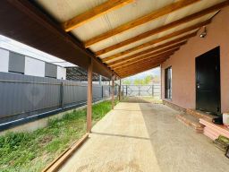 Забор по периметру установлен из металлопрофиля. Ворота открываются на внешнюю сторону.
