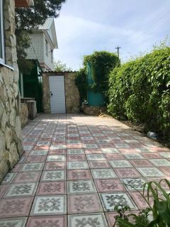 Имеется площадка, залитая бетоном, для парковки нескольких автомобилей, придомовая территория выложена тротуарной плиткой.