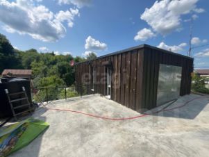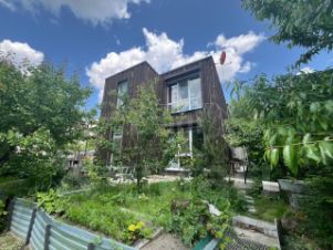 Строение выполнено с учетом современных технологий: фундамент — плита с рёбрами и сваями, стены — газобетон толщиной 30 см с защитной покраской и вентилируемым фасадом из доски. Подземная часть дома утеплена, а перекрытия первого и второго этажей выполнены из монолита, что обеспечивает надежность и долговечность. Плоская наплавляемая кровля добавляет современный штрих.