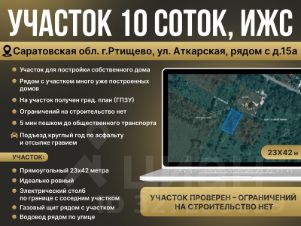 Пpодаетcя ровный земельный учаcток 10 соток, в г.Ртищево по ул. Аткарская, напротив д. 15а, микрорайон Ртищево 2.
