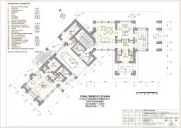 Планировка дома: На первом этаже холл, гостиная, столовая, кухня, гостевой санузел, кладовая, постирочная, мастерская, помещение гаража на одно машиноместо, электрощитовая, котельная. Помешение гаража сблокировано с банным комплексом и помещением истопной бани, имеющими отдельные входы с улицы.