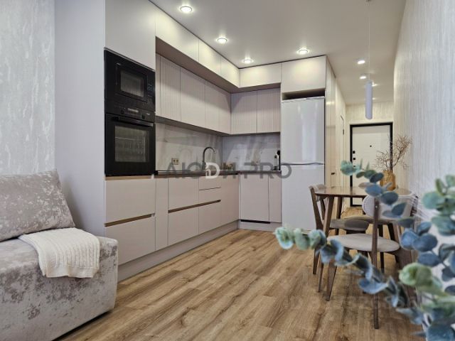 Пластиковые стеклопакеты, натяжные потолки со встроенным освещением, напольное покрытие: ламинированный паркет и плитка, надежная входная дверь премиум-класса.