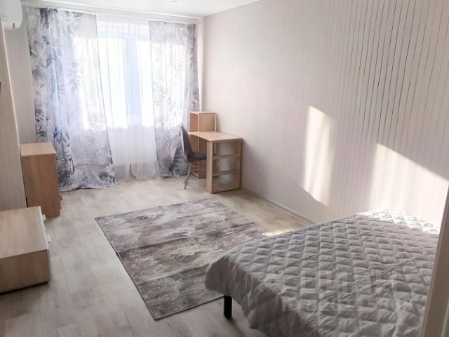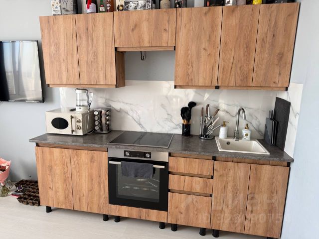 В спальне: двуспальная кровать с ортопедическим матрасом и гардеробная; в кухне - гостиной: двуспальный диван, кухонный стол и стулья, большая тумба, сплит-система, холодильник, встроенная кухонная техника (индукционная варочная панель, духовой шкаф Bosch, СВЧ-печь), 2-я гардеробная. Просторный совмещённый санузел оборудован ванной, столешницей с раковиной, стиральной машинкой, полотенцесушителем.